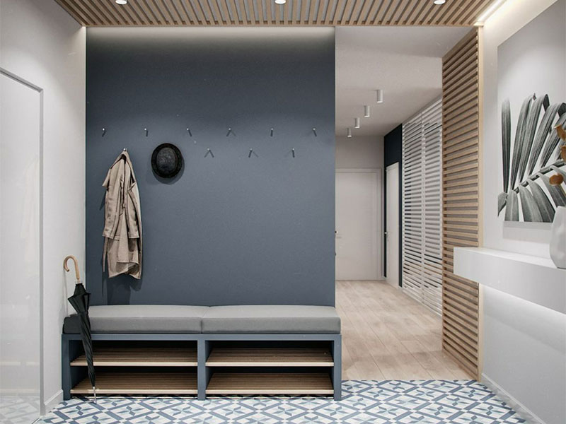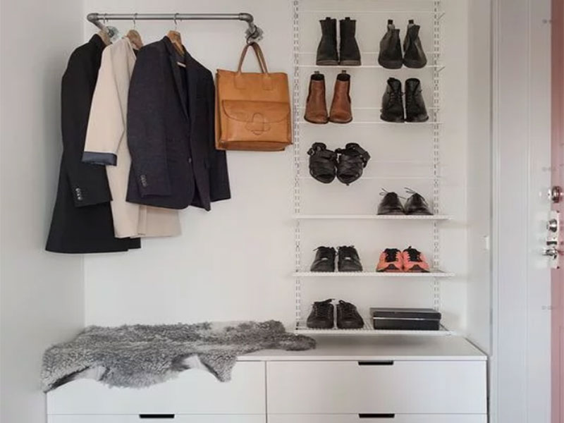 開放式的階梯鞋帽架,利用小的空間設置盡可能多的層級,也因而增加了低處的儲物空間,同時,其頂部的掛鉤也被設計在全家人伸手可及的范圍,方便隨手收納。