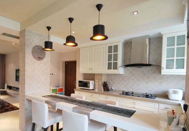 2、鋁扣板:鋁扣板壽命長,能夠防火防潮防靜電。這間廚房空間足夠大,選用了鋁扣板,同時吊燈也是頗有金屬感的材質,整體看起來非常富有現(xiàn)代感和時尚感。